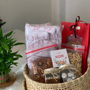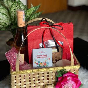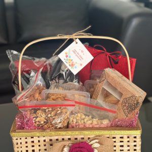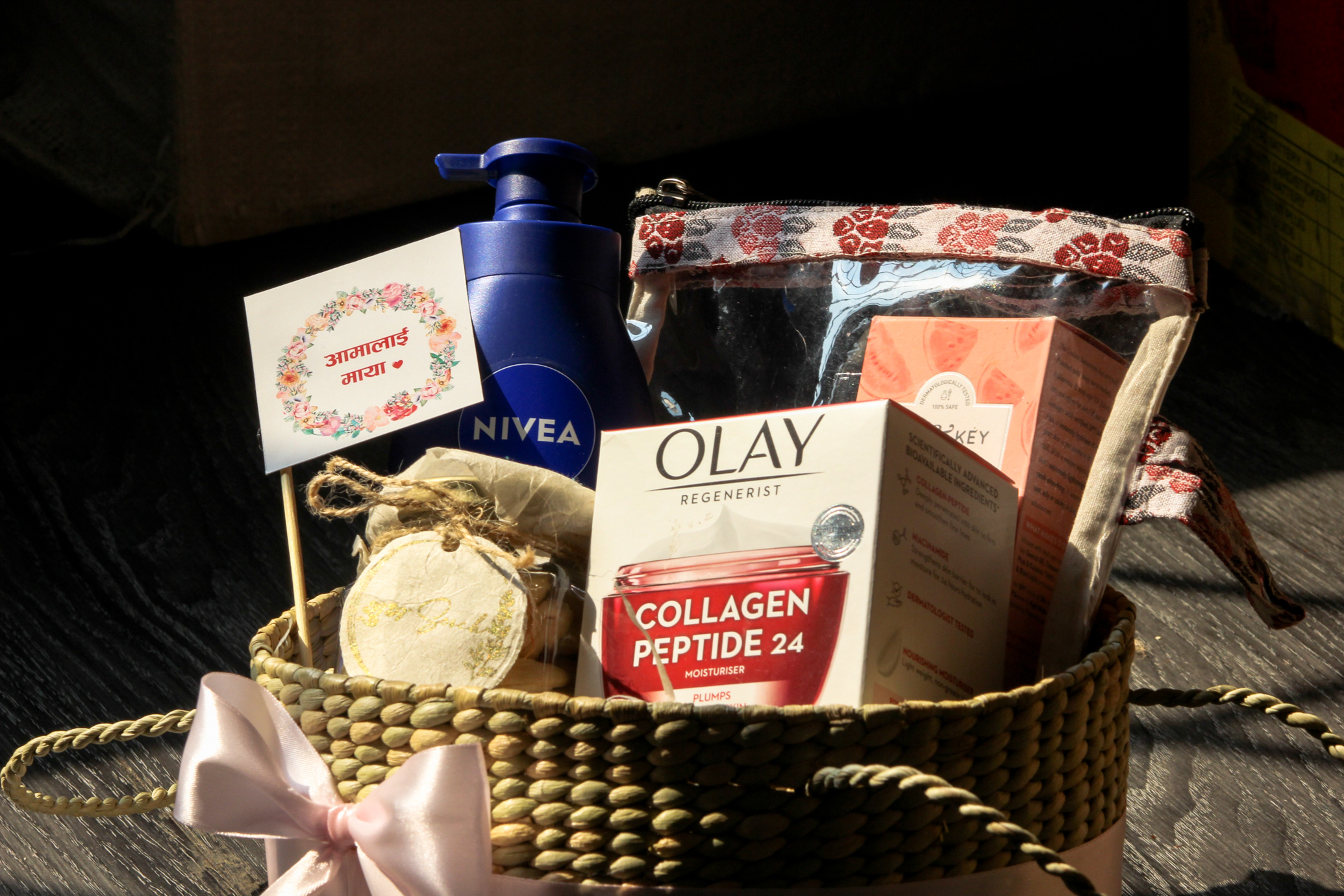 Selfcare basket to pamper your mother. It includes nivea body lotion, cosmetics pouch, sunscreen, eyeshadow, lip gloss, rose clip, blush, olay and nuts.