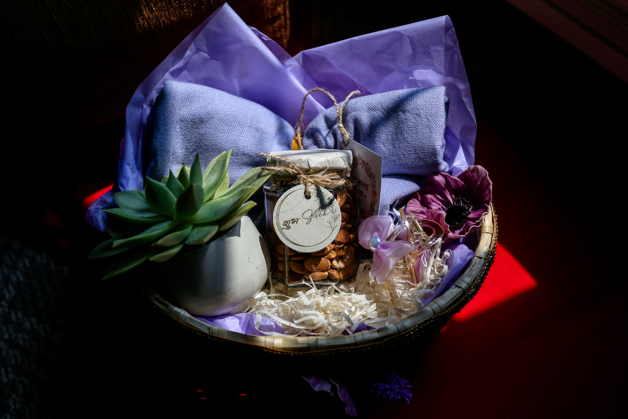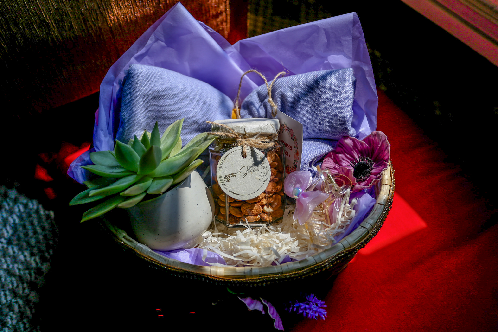 Hamper full of goodness like shawl, nuts, plant and clutch.